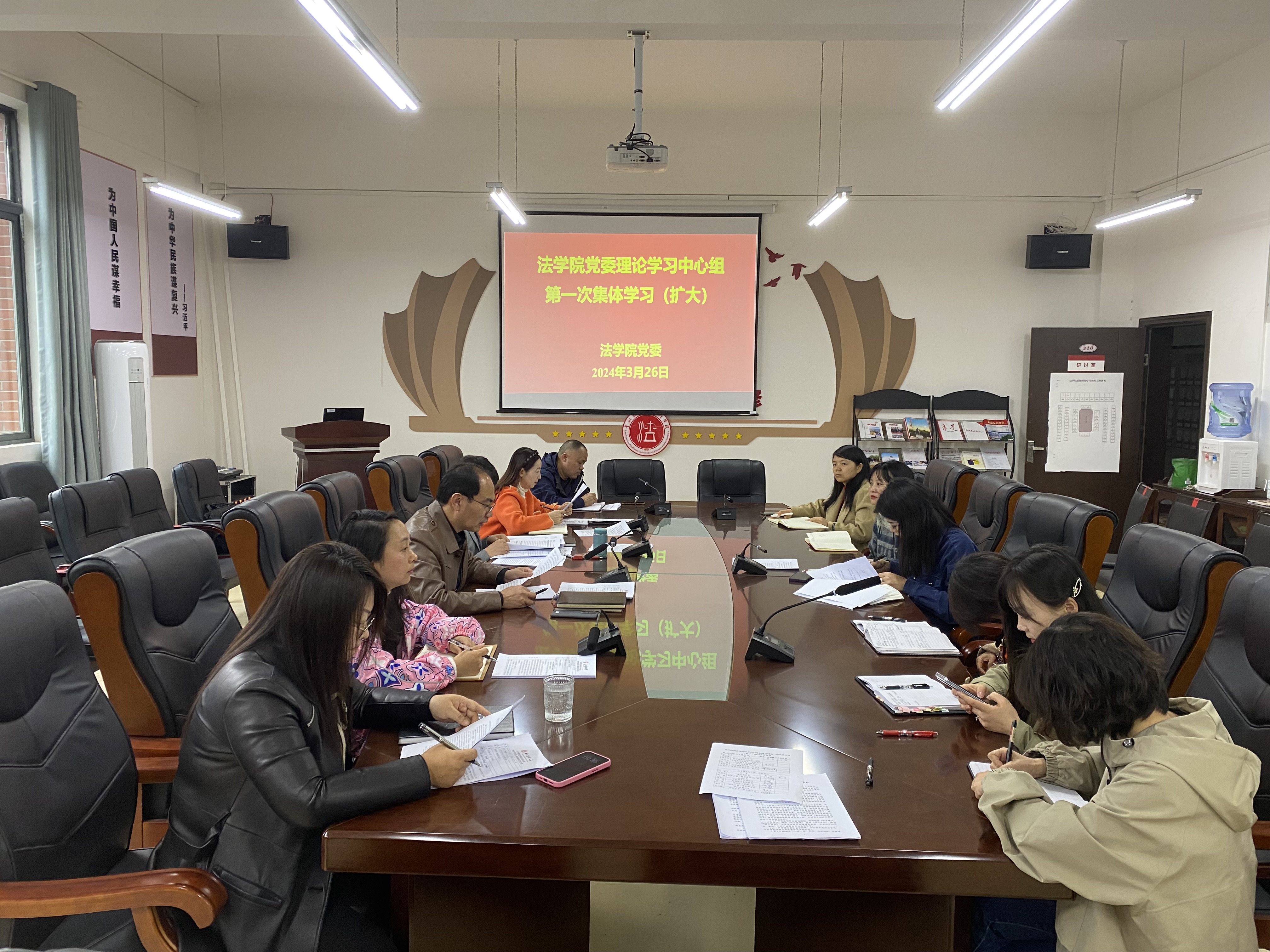 (法学院 莫丹洵 报道|摄影 )3月26日,法学院党委理论学习中心组举行2024年度第一次集体学习(扩大)研讨会。学院领导、科级干部及党支部书记参加会议,院党委书记邵新顺主持会议。
