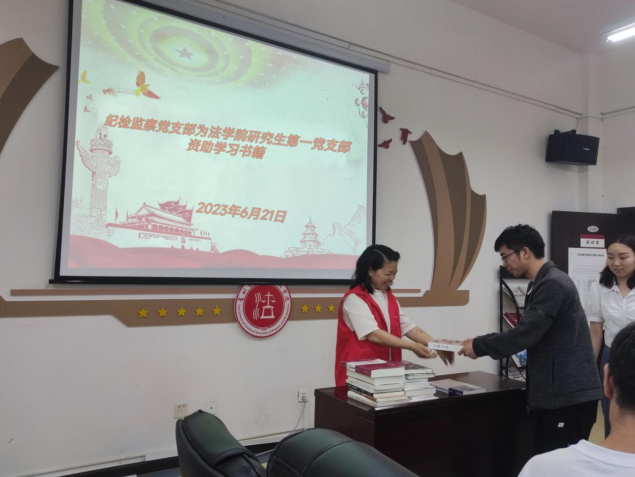 (法学院 图文/报道 田露丹)为扎实推进党支部共建,提升法学院学生的专业素养,2023年6月21日上午,纪检监察党支部资助法学院研究生第一党支部贫困生党员及入党积极分子的学习书籍全部发放。
