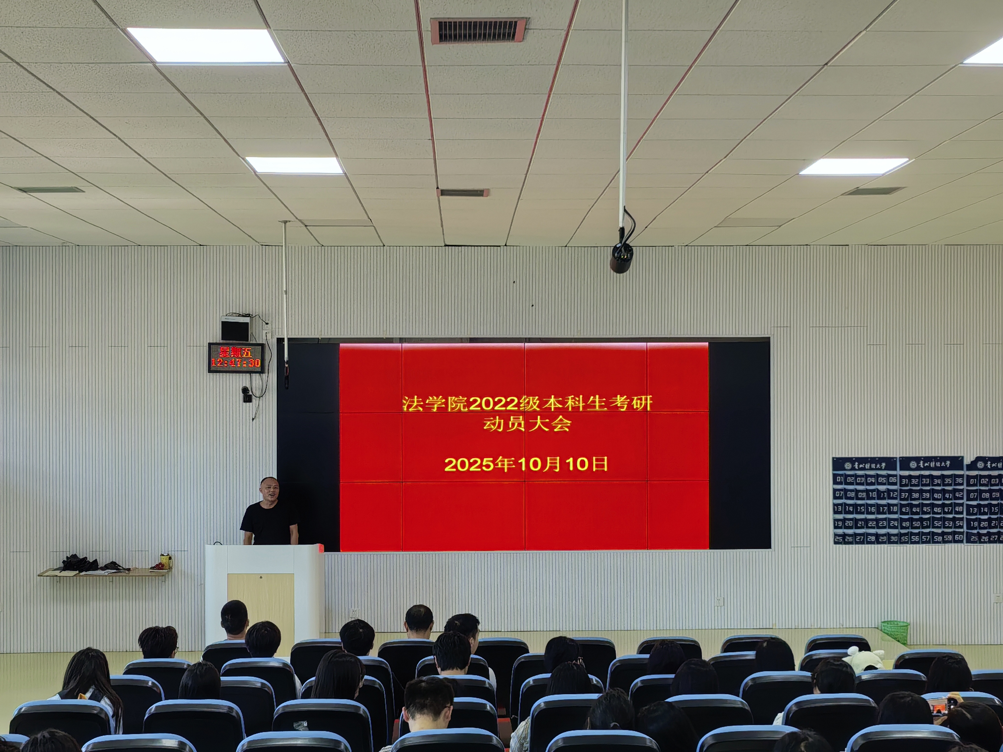 (法学院 潘吉脉 报道、摄影)为帮助2022级本科生明确考研目标、把握备考方向,凝聚考研信心与力量,10月11日,我院22级本科生考研动员大会在乐学楼201召开。院党委书记邵新顺、副院长(主持工作)曹务坤、副书记彭华、辅导员潘吉脉及2022级全体本科生参加会议,会议围绕考研政策解读、备考规划指导与思想动员展开,为即将踏上考研征程的学子们注入强劲动力。