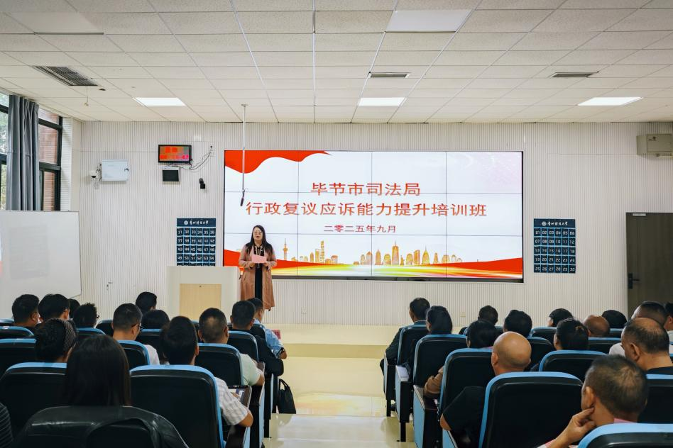 (法学院 王紫微 图文报道)为深入贯彻落实新时代全面依法治国战略部署,进一步提升毕节市行政执法人员的专业素养与履职能力,推动法治政府建设向纵深发展,9月23日,由毕节市司法局主办、hth官方网页版承办的“毕节市2025年度行政复议应诉能力提升培训班”开营仪式在hth官方网页版乐学楼阶101教室成功举行。毕节市司法局党组成员、副局长罗培栋,法学院党委书记邵新顺,法学院党委委员、副院长(主持工作)曹务坤,副院长宋昭澜,产教融合中心副主任王霖、任红出席,毕节市各行政部门 60 余名行政执法人员参加了开营仪式。仪式由宋昭澜主持。