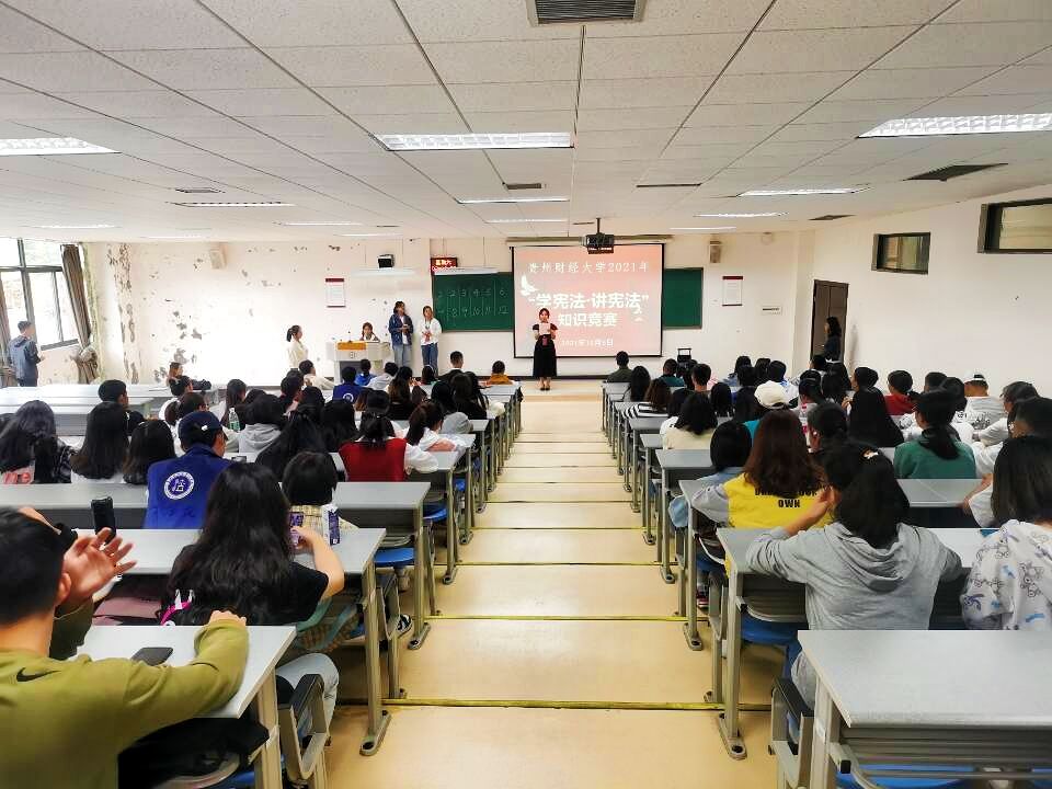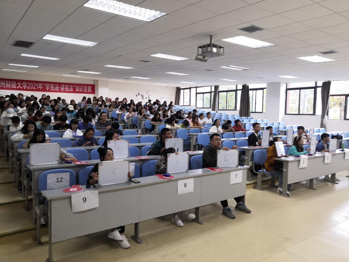 为深入开展以宪法为核心的法治宣传和教育,加强对hth(中国)法治思想的学习贯彻,不断提高hth官方网页版学生法律意识,引导学生深入遵崇宪法、学习宪法。10月9日上午,hth官方网页版在乐学楼1-1教室举行2021年“学宪法 讲宪法”知识竞赛。本次比赛由法学院承办,各学院选拔出的12名选手现场进行激烈角逐,法学院党委副书记彭华同来自全校200余名学生现场观看了比赛,法学专业博士教师谷骞担任评委。