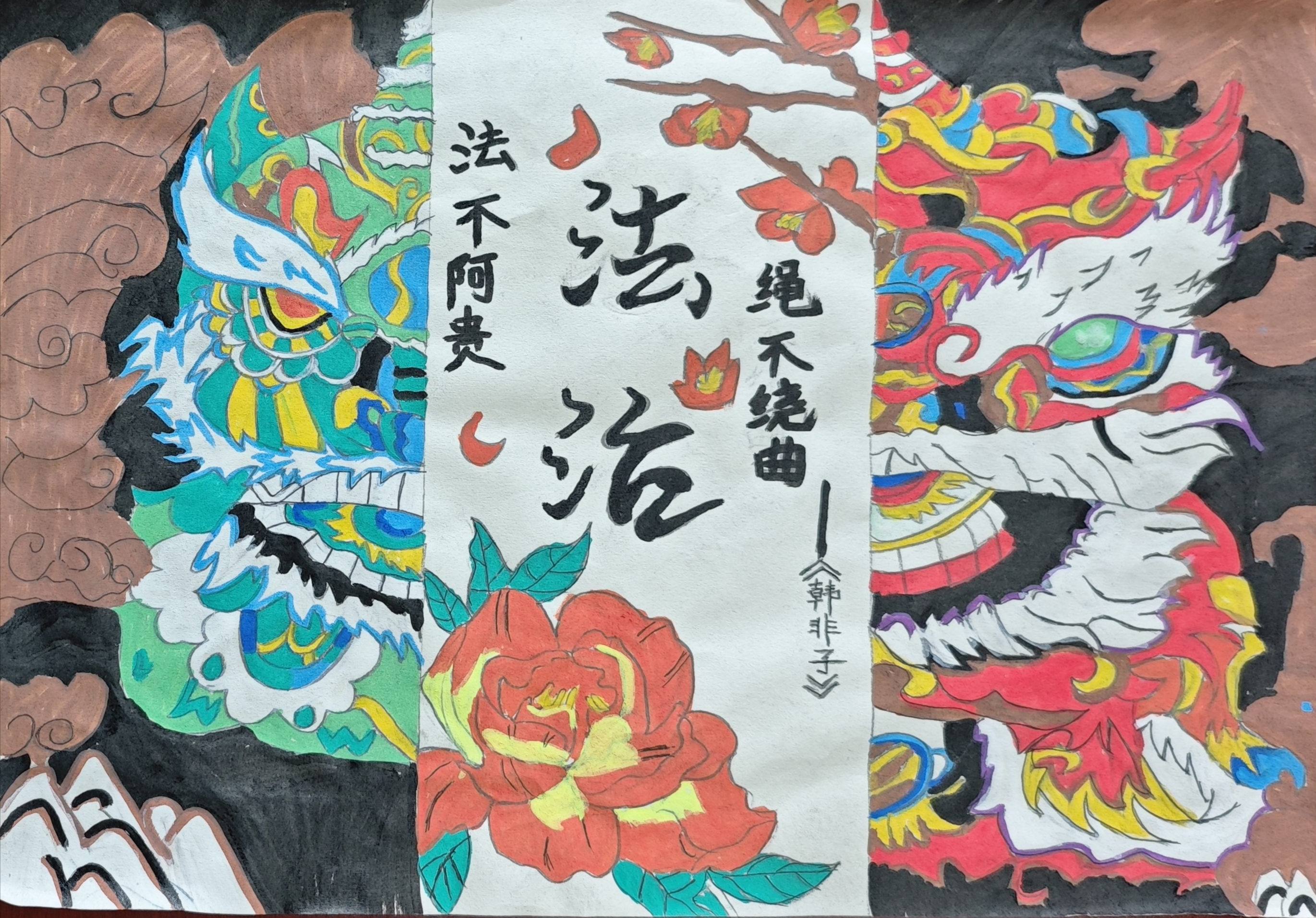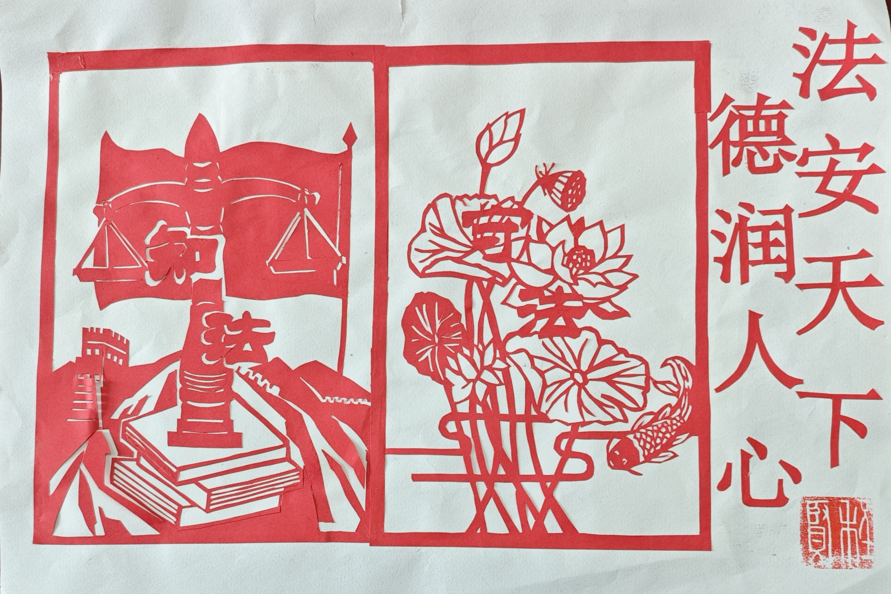 《法安天下,德润人心》剪纸:以非遗剪纸的细腻刀工为媒,将天平、法槌等法治符号与莲花等德治意象精妙交织,以一剪一纸的匠心,诠释了“法为基石安天下,德为养分润人心”的深层内涵,让法治的庄重与德治的温情在传统艺术中相映成辉,传递出刚柔并济的社会治理理念。