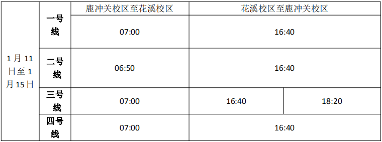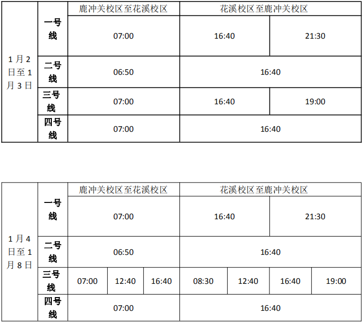 按照学校统一安排,hth官方网页版鹿冲关校区、花溪校区进入期末考试阶段, 1月8日考试结束,为满足期末考试需要和行政科研工作的开展,现对交通车作如下调整:
